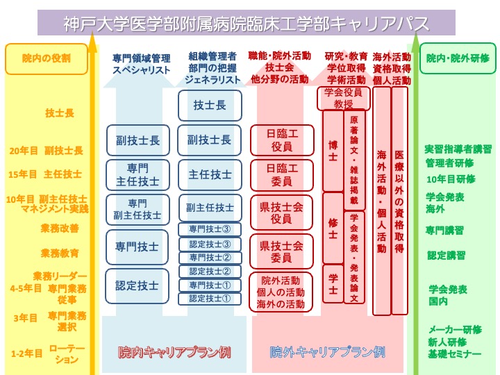 神戸大学医学部附属病院臨床工学部には7つの業務、4つの組織横断的な係活動があります。専門性の確立はもちろんですがミーティングや意見交換などを積極的に行い、風通しの良い組織づくりに取り組んでいます。 また、社会人として希望する仕事ができること、仕事が充実していること、仕事を通して成長できることは非常に重要です。これを実現できるよう実習生・新卒者の教育に特に力を入れるとともに、社会人大学院への進学や海外派遣、研究開発、資格取得のサポートなど多くの機会を提供できるよう体制つくりにも取り組んでおります。