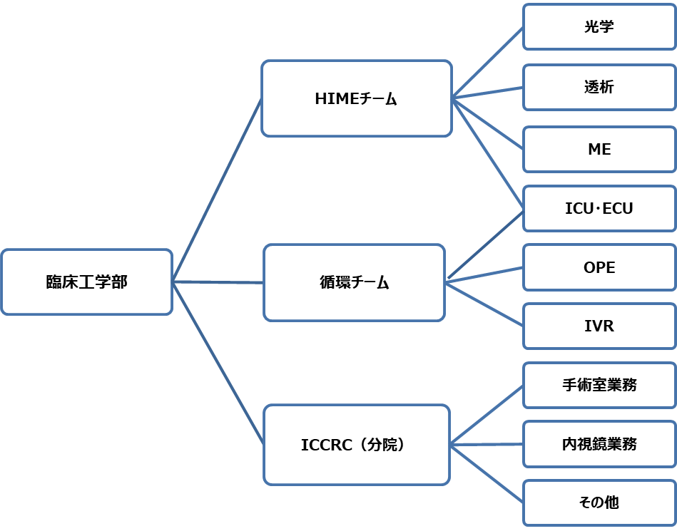 神戸大学医学部附属病院臨床工学部には7つの業務、4つの組織横断的な係活動があります。専門性の確立はもちろんですがミーティングや意見交換などを積極的に行い、風通しの良い組織づくりに取り組んでいます。