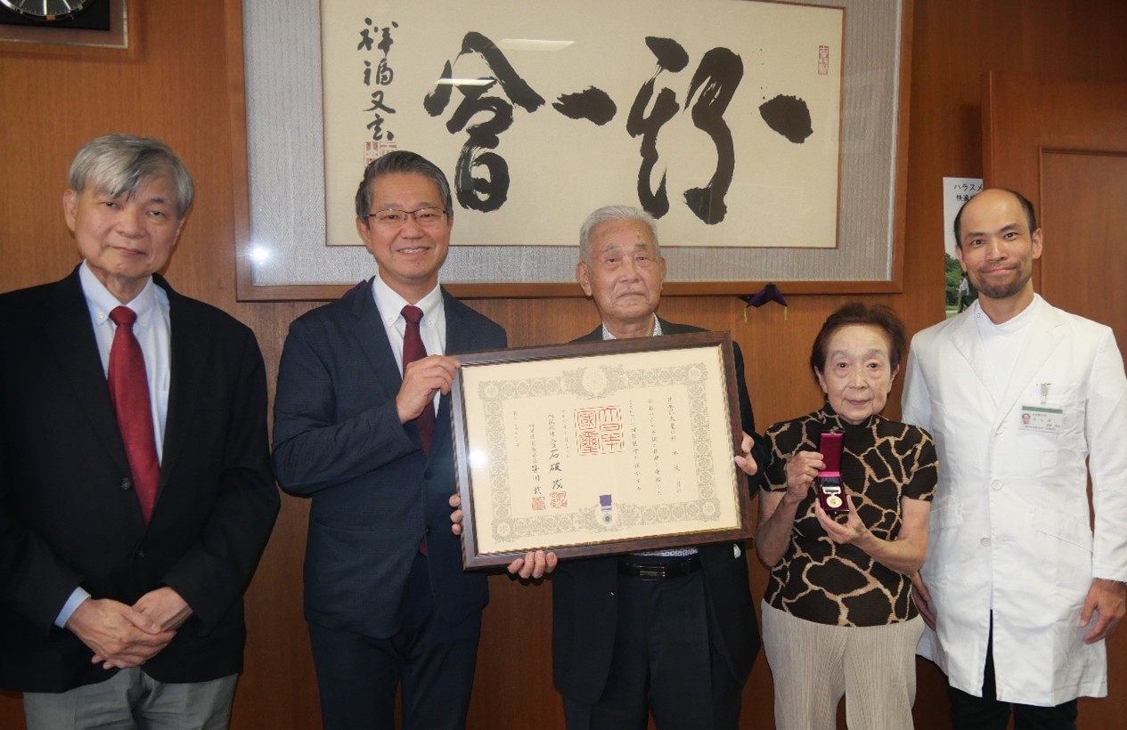 医学部附属病院の診療研究の発展のため「肝胆膵外科診療研究助成金」に多額のご寄附をいただきました杉本茂男様に対し、日本国政府より紺綬褒章(※)が授与されました。これを受け、2025年9月9日に医学部附属病院において伝達式を執り行いました。