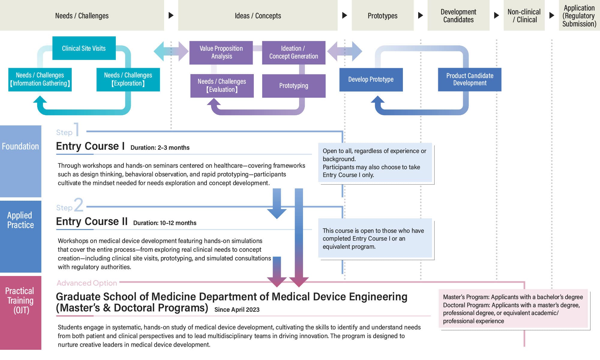 At Kobe University, human resource development for medical device innovation is supported through the Medical Device Producer (MDP) Training Program (Entry Courses I & II) and the Master’s and Doctoral programs in the Graduate School of Medicine’s Department of Medical Device Engineering. In 2025, the Undergraduate Program in the Faculty of Medical Device Engineering was also launched.